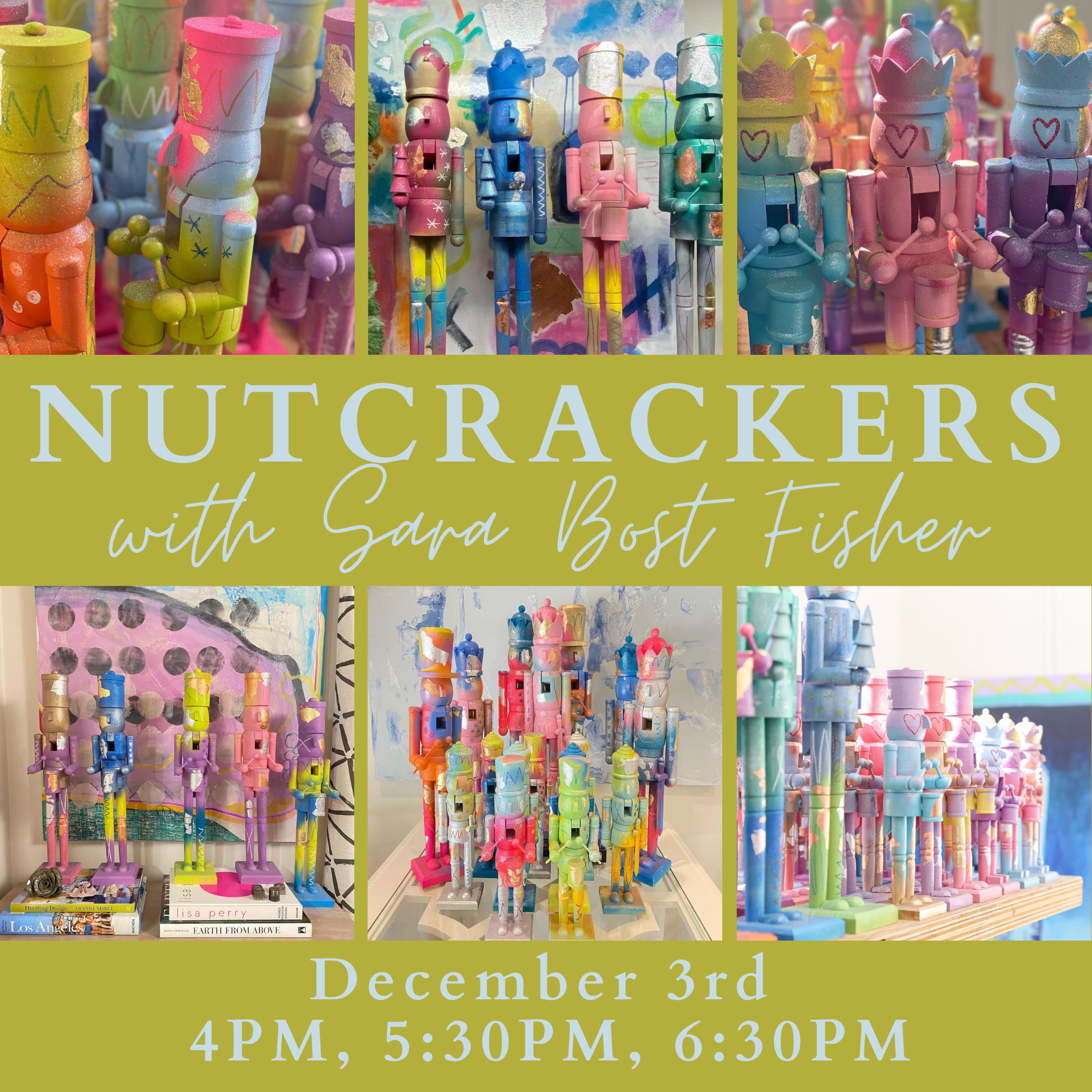 Oklahoma artist, Sara Bost Fisher, will be teaching a nutcracker painting class in our showroom! She will be sharing her tips and tricks to achieve her signature SBF whimsical style showcased in all of her mixed media masterpieces.